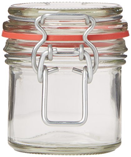Traditional clip-top airtight glass jar, for long-term storage of your delicious home-made jams, conserves, jellies, pickles, sauces, chutneys, pates and more. Lever-arm lid has rubber seal, for which replacements are also available. Capacity: 125ml. Measurements: 7.5cm high x 6cm diameter.